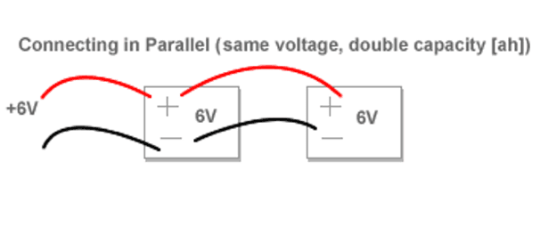 Connecting in Parallel: When connecting in Parallel you are doubling the capacity (amp hours) of the battery while maintaining the voltage of one of the individual batteries. This would be used in applications such as laptop batteries, some scooters, some ups backups, etc. Use a jumper wire between the positives of both batteries and another jumper wire between the negatives of both batteries. Connect your positive and negative wires to the same battery to run to your application.