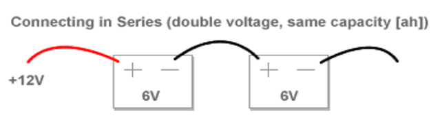 Connecting in Series: When connecting your batteries in Series you are doubling the voltage while maintaining the same capacity rating (amp hours). This might be used in a scooter, Power Wheels kids vehicle, or other applications. Just use a jumper wire between the negative of the first battery and the positive of the second battery. Run your negative wire off of the open connector from the first battery and your positive off of the open connector on your second battery.